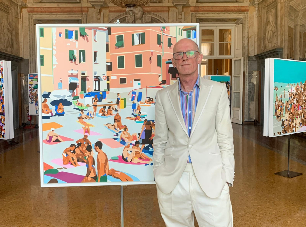 “Life in Transit”, questo il titolo della mostra, raccoglie 18 tele originali in cui Hawke reinventa la villeggiatura mediterranea attraverso personaggi e scorci ispirati a Genova, alle sue spiagge e alla ricca architettura della villa stessa. L’artista ha reinterpretato anche gli affreschi cinquecenteschi del Salone d’Onore, opera di Giovanni Battista Castello, detto il Bergamasco, trasportando i personaggi mitologici in una scena balneare contemporanea. Un omaggio ironico e raffinato alla stratificazione di storie e suggestioni che abitano questo luogo unico.