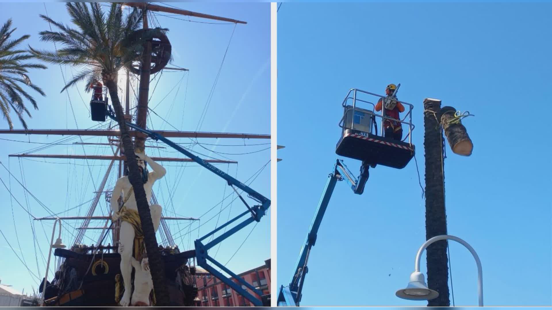 Intervento urgente questa mattina al Porto Antico, nella zona adiacente al Galeone, dove una palma è stata abbattuta a seguito di una repentina inclinazione del tronco verso levante, che ha fatto scattare l’allarme per la sicurezza pubblica.