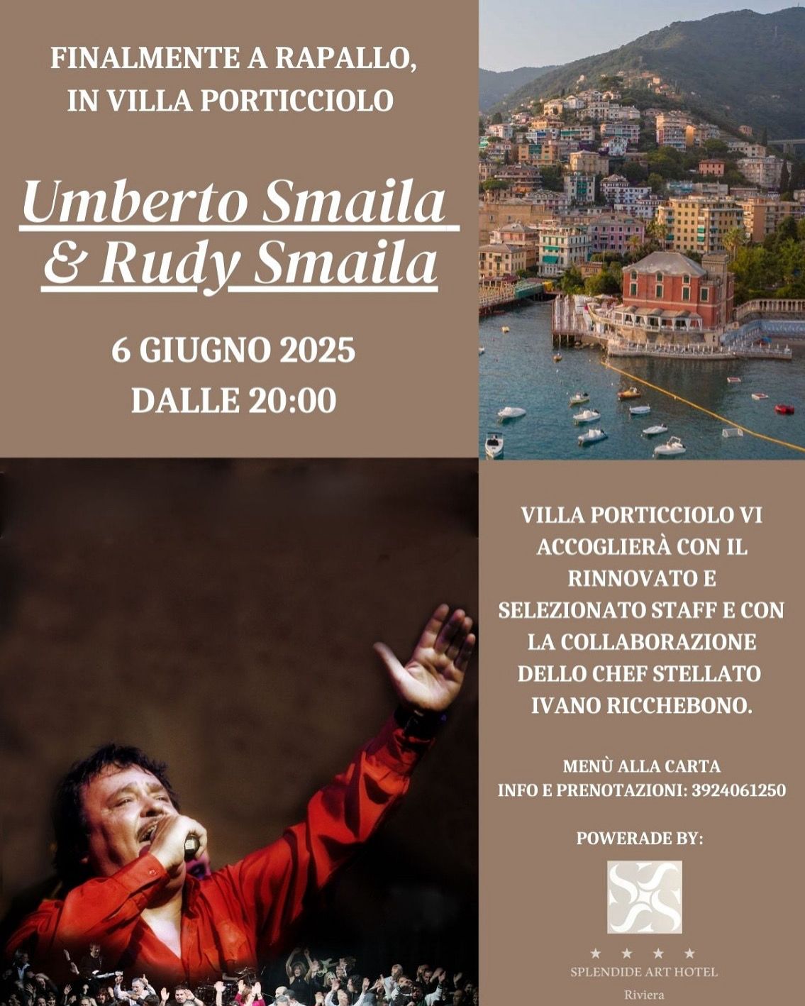 Musica e intrattenimento – Il debutto è fissato per venerdì 6 giugno: Umberto Smaila, volto storico della musica e della televisione italiana, porterà il suo show live a Rapallo, accompagnato dal figlio Rudy. Le serate continueranno il 4 e 19 luglio, il 2 e 30 agosto, trasformando la villa in un palcoscenico a cielo aperto.