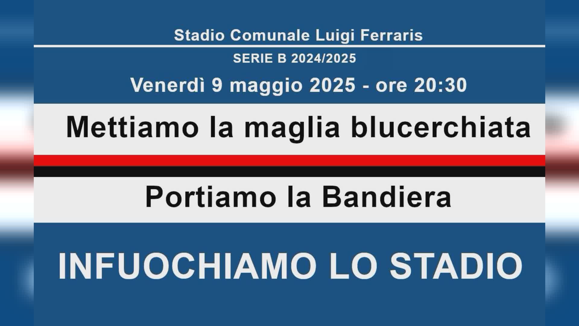 Domani partita della vita. La risposta dei tifosi è fantastica ma non ci sorprende: il posto dei Sampdoriani è al suo fianco, allo stadio, soprattutto nel momento più difficile della nostra storia. Noi stiamo facendo la nostra parte, vedremo quelli in campo. Un appello, facciamolo girare nelle chat, e soprattutto facciamo passaparola dal vivo. TUTTI con la maglia blucerchiata. TUTTI con una bandiera, piccola o grande che sia. Domani è una giornata per cuori forti, ma qualsiasi cosa ci sia nel nostro destino, avremo sempre la maglia e la bandiera più bella del mondo. COLORIAMO LO STADIO DI BLUCERCHIATO!