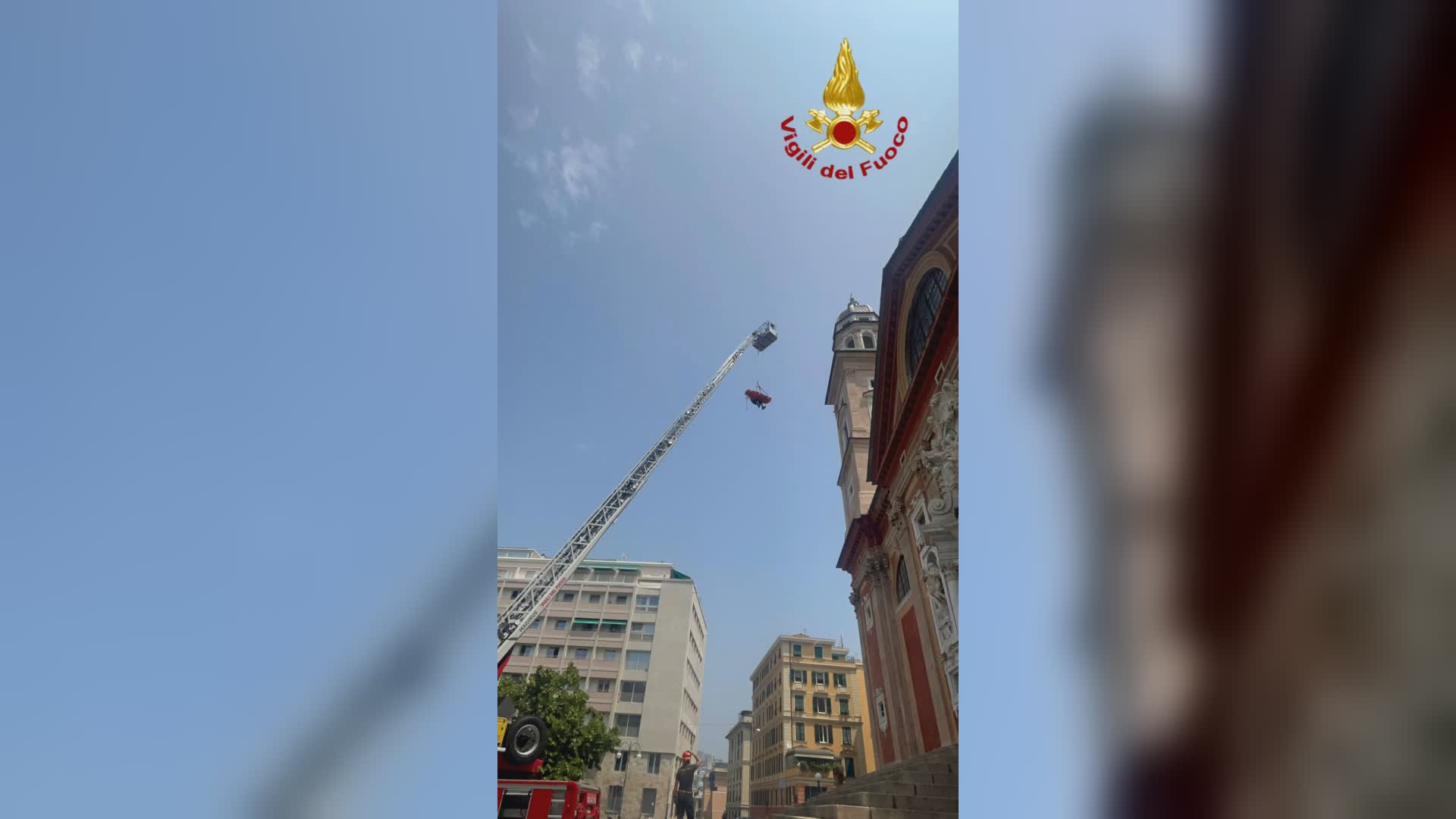 Intervento con la gru questa mattina da parte dei Vigili del Fuoco di Genova, inviati a Carignano nella piazza della Basilica di Santa Maria Assunta.
