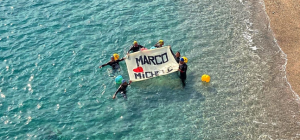 Bergeggi, in mare con uno striscione per Pantani e Scarponi durante la Milano-Sanremo