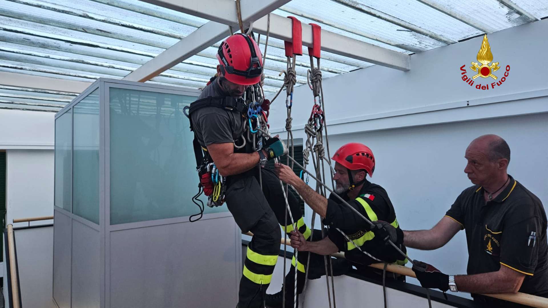 Soluzione – A quel punto, i Vigili del Fuoco hanno deciso di adottare tecniche di soccorso alpinistico. Dopo un’attenta valutazione strutturale, è stato predisposto un armamento sicuro sui travi che sorreggono la copertura delle scale. Attraverso un sistema di corde e carrucole, la barella è stata lentamente calata lungo il vano scala fino al piano terra.